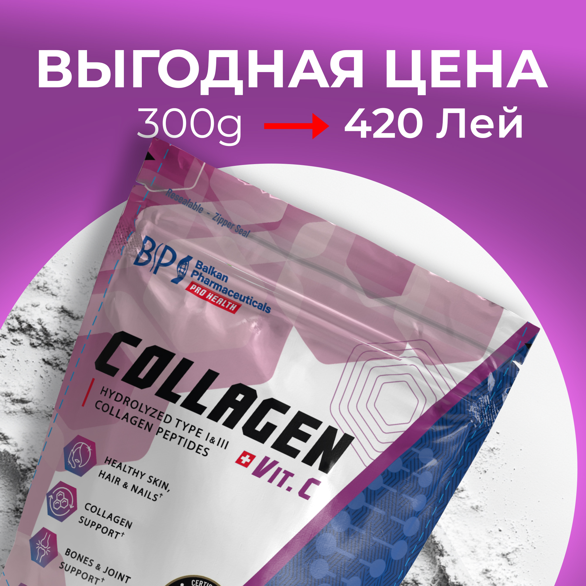 • Содержит 8320 мг Гидролизованного Коллагена типа I и III (Peptan®, бычьего происхождения), в комбинации со 180 мг Витамина C (в виде аскорбиновой кислоты) на порцию для более эффективной борьбы с признаками старения;
